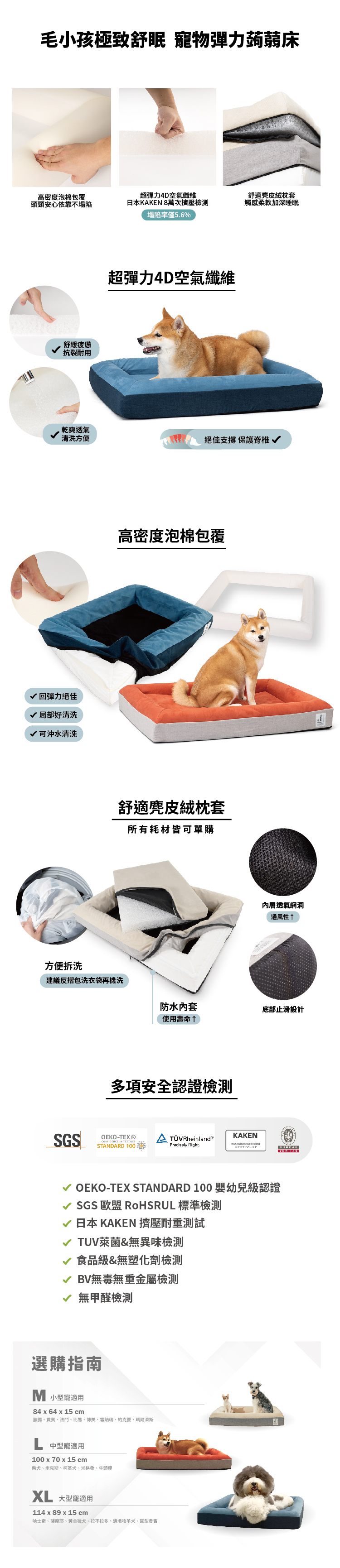 寵物彈力蒟蒻床內芯選用4D空氣纖維材質,舒緩睡眠品質不佳及老齡寵物疲憊。