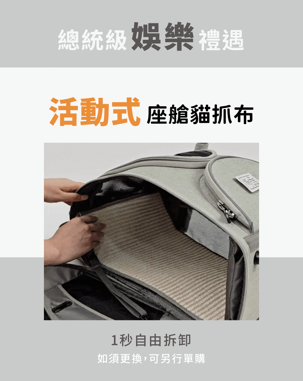全套配備:貓包本體*1、貓抓布*1、保潔墊*1、配件袋*1、安全扣繩*1