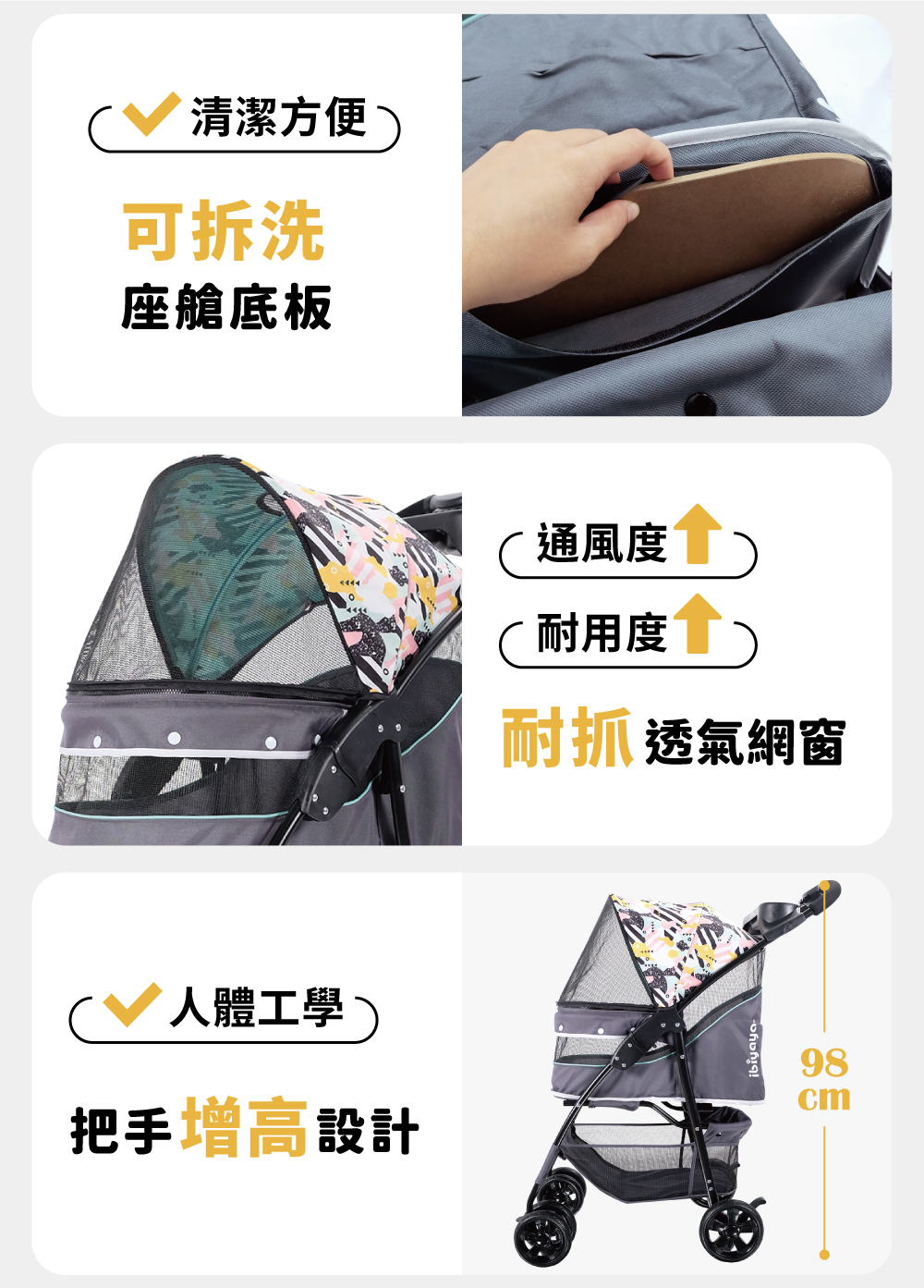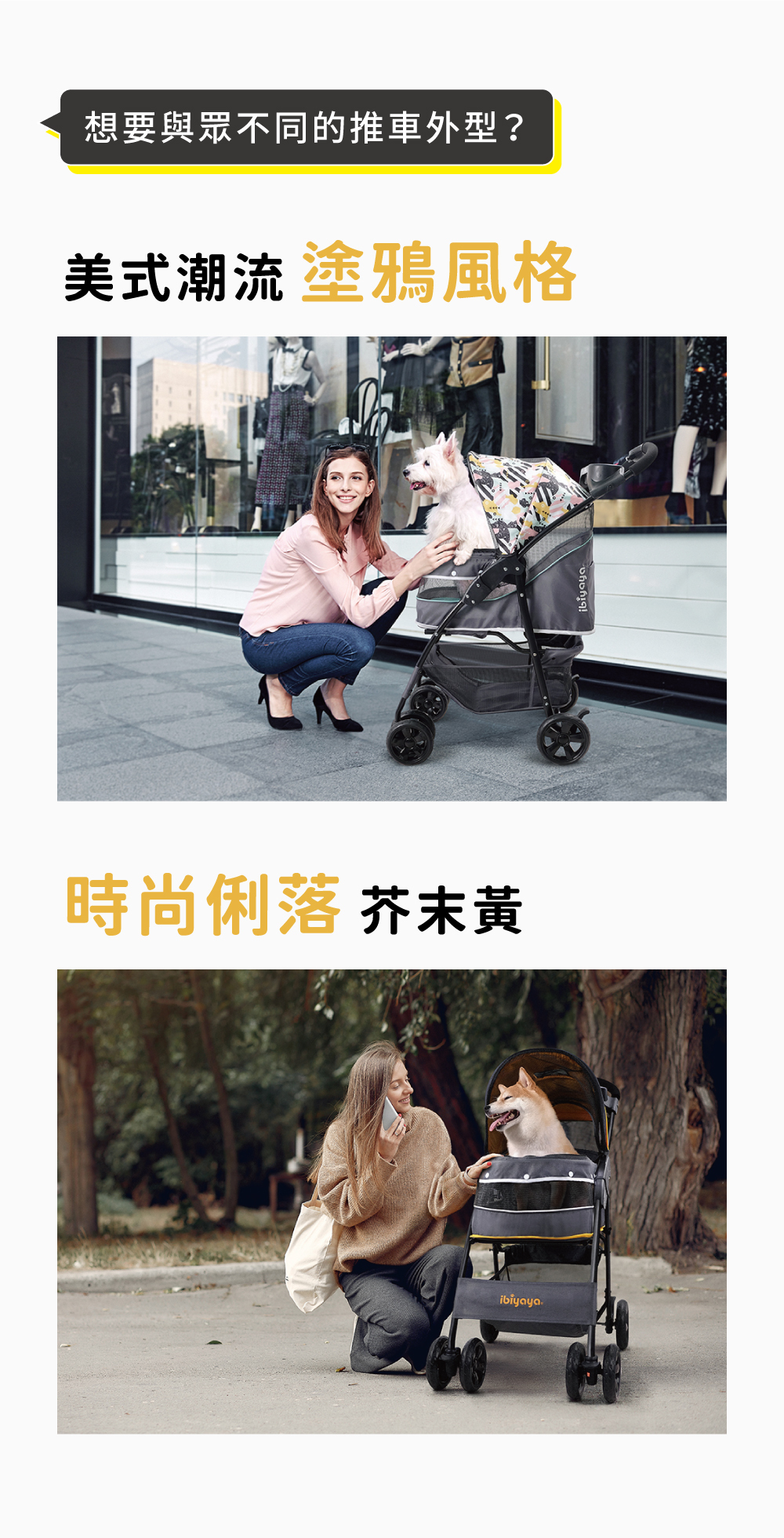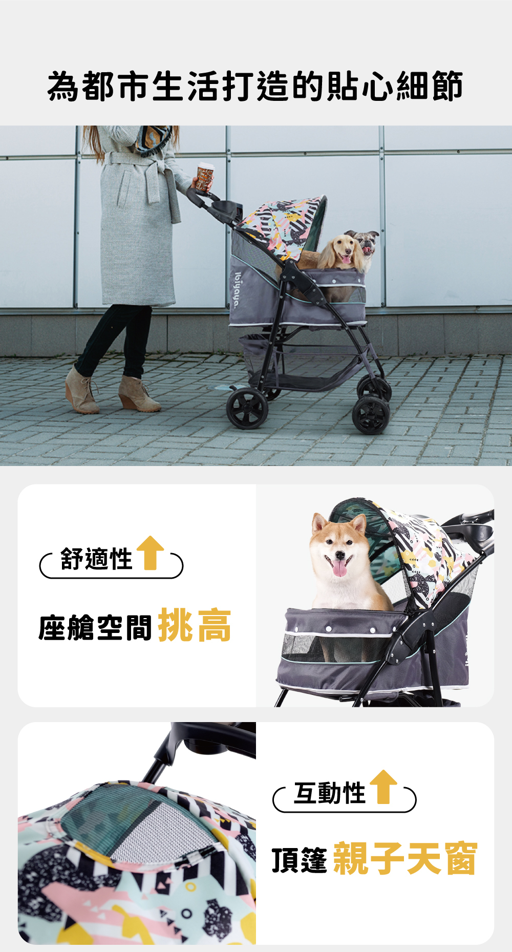 外型設計採用芥末黃和塗鴉綠等時尚色彩,讓寵物推車不僅是提供安全和保護的工具,還能讓毛小孩更加時髦與前