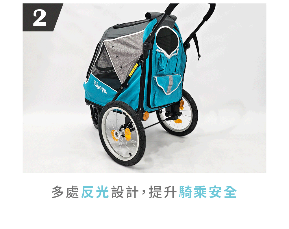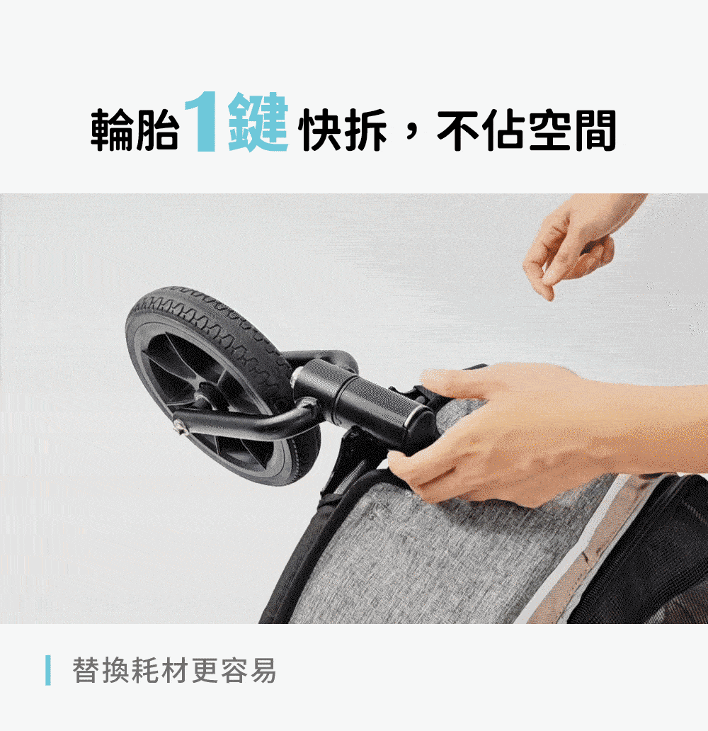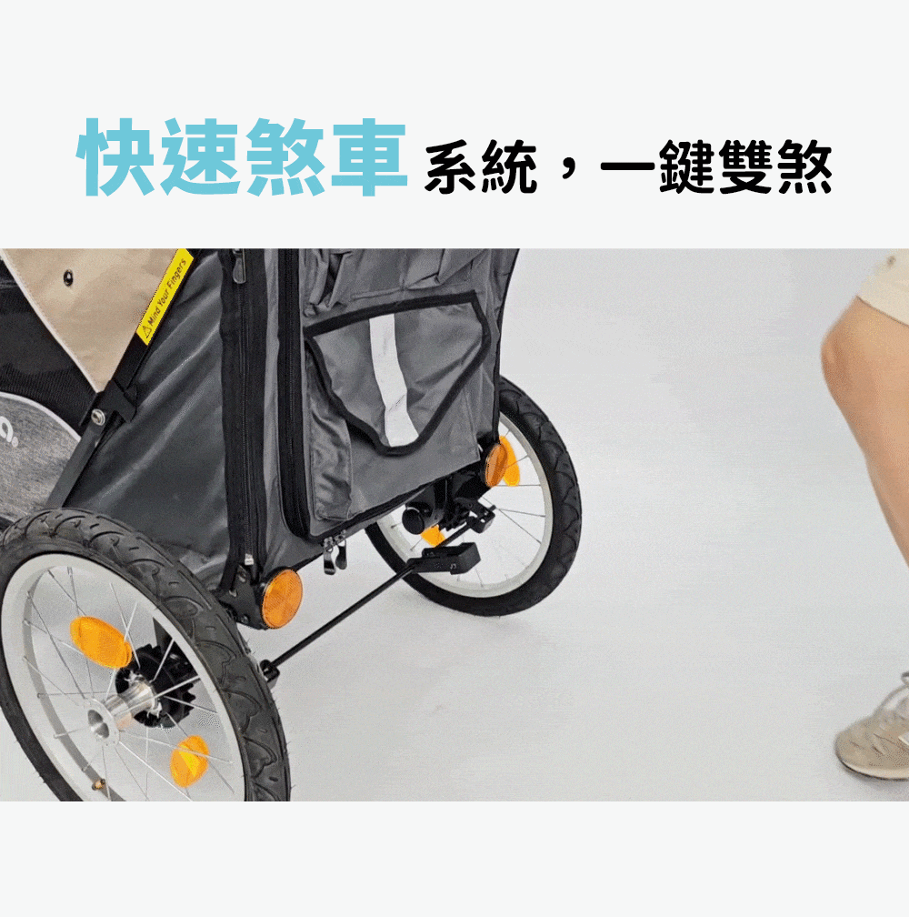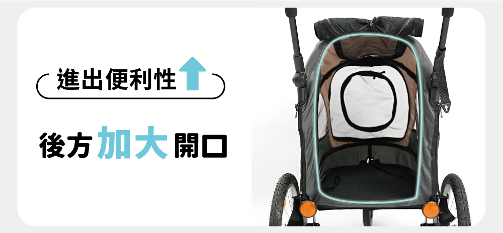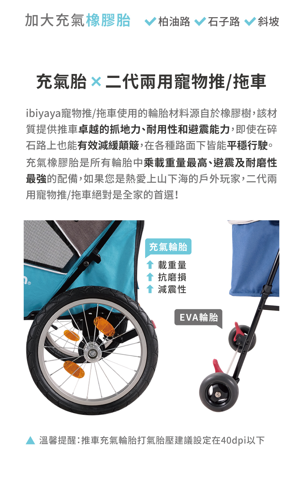 後輪充氣胎加大設計,兼具彈性及避震效果,顛簸路面都能輕鬆行駛,是帶毛小孩到戶外運動的推薦首選!