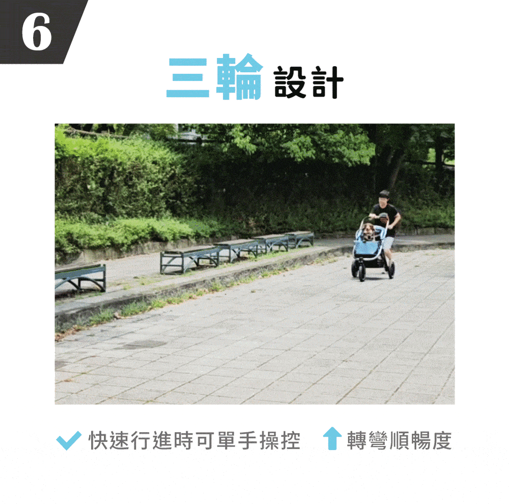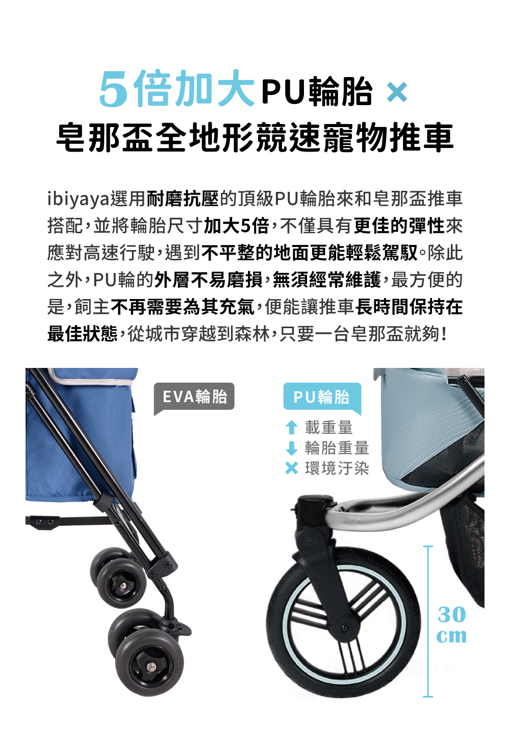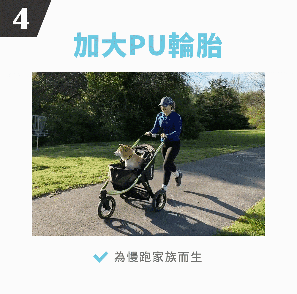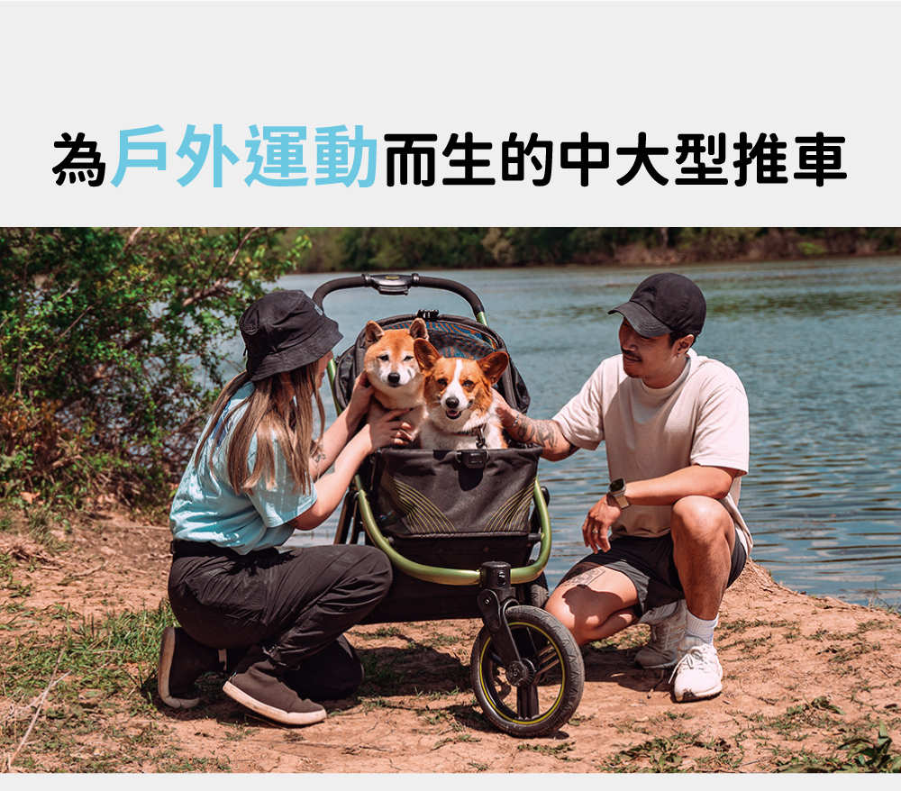 我們研發全國獨創的寵物跑車,使用輕鬆駕馭多種地形的加大PU輪胎。