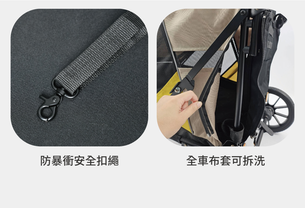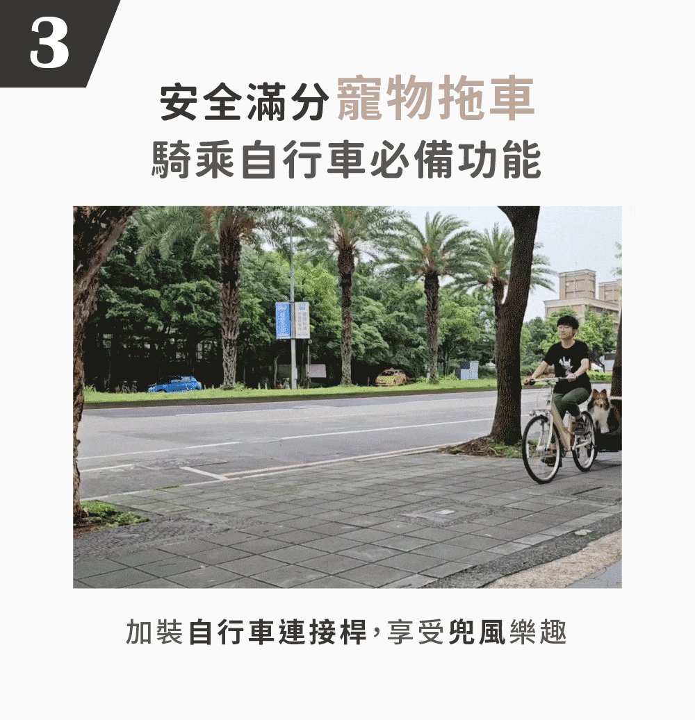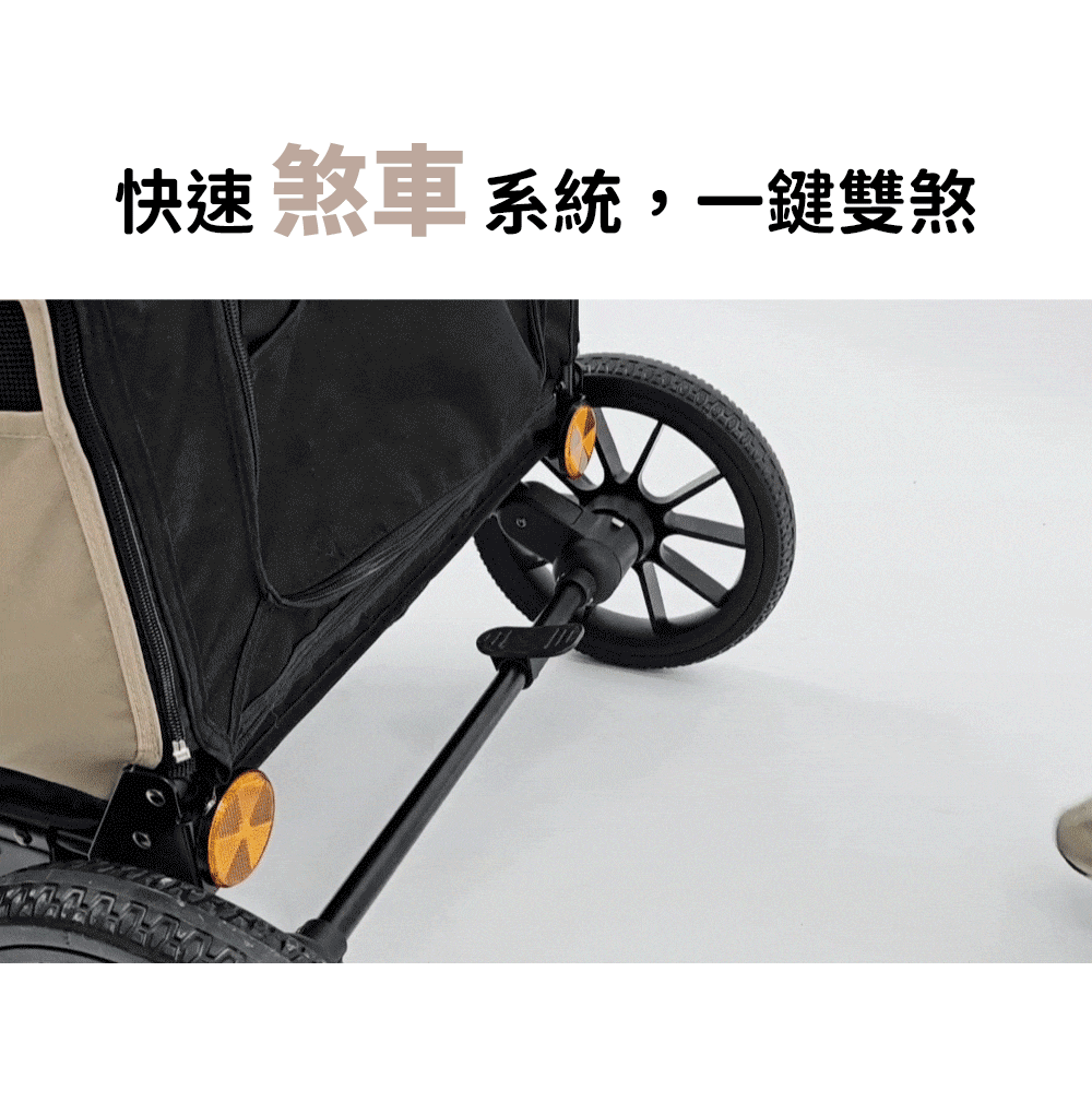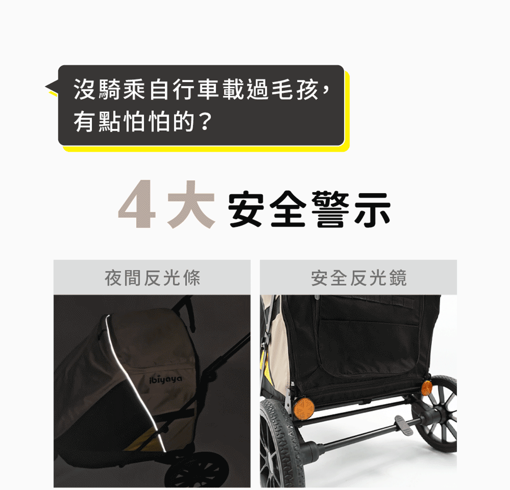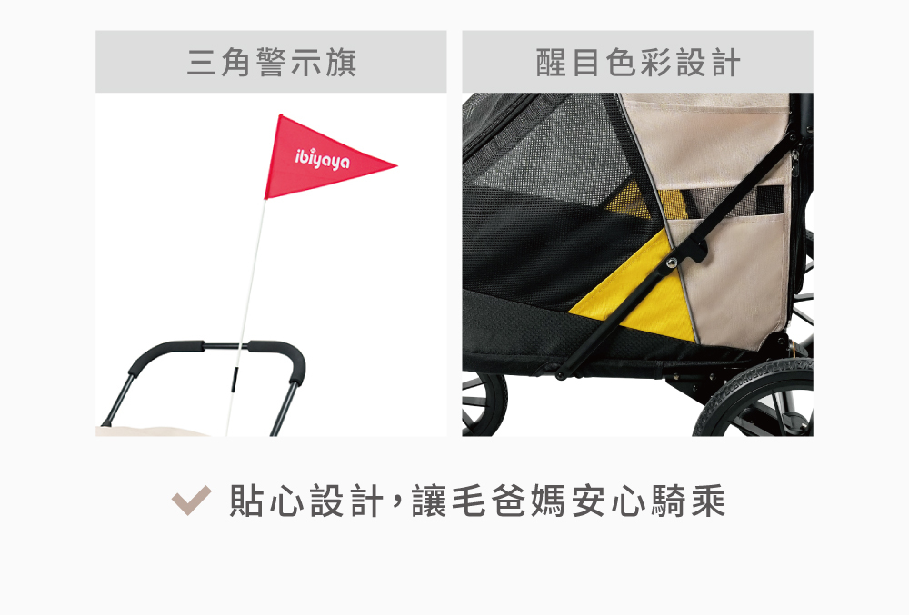 當它作為一台「寵物拖車」時,爸媽只須安裝自行車專用連接桿在腳踏車和推車之間,便能和毛孩共享兜風樂趣!推車上的夜間反光條橫跨整個座艙,搭配後方的反光片及帥氣的紅色三角警示旗,都為毛家庭帶來更安全的騎乘體驗。