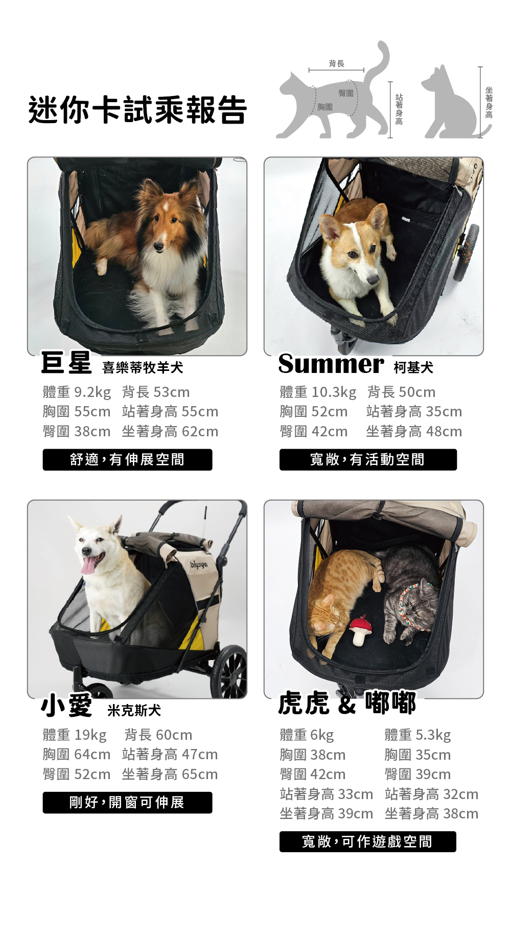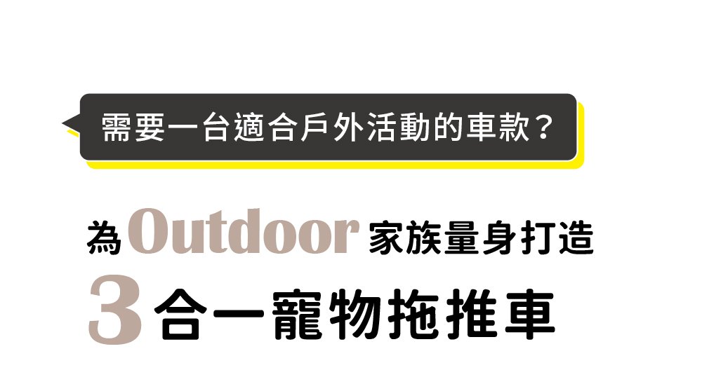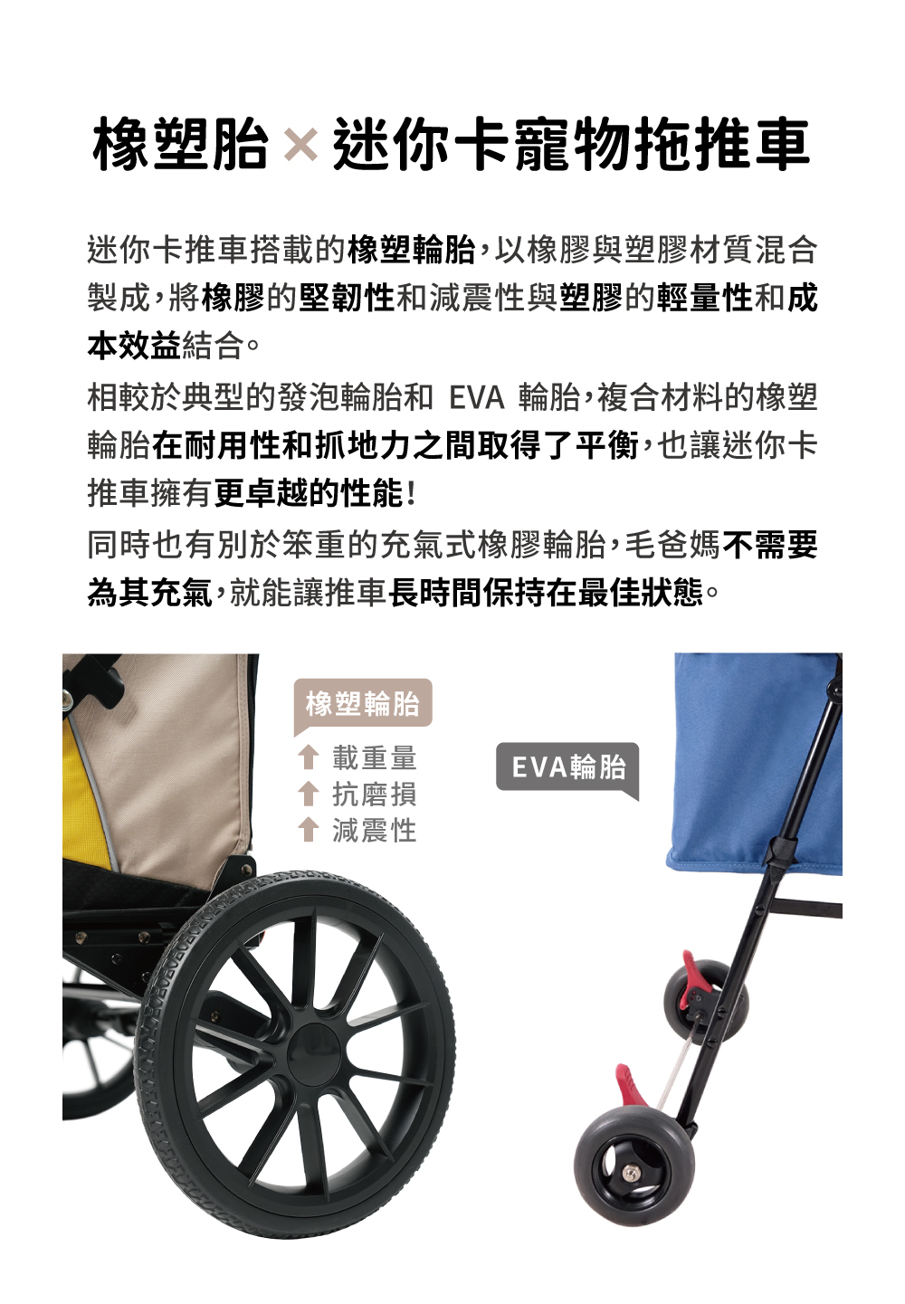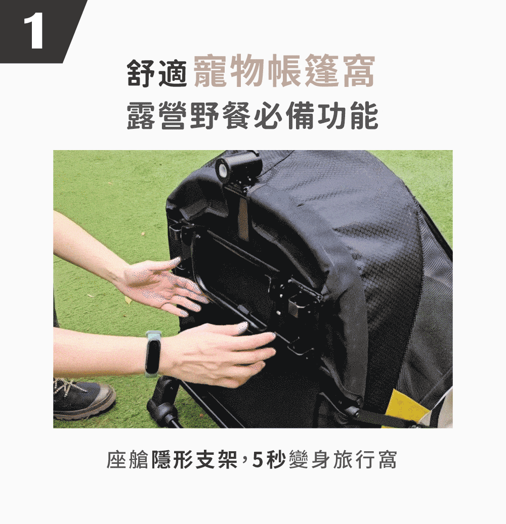 為了滿足大家的渴望,我們孕育這台 Outdoor 派必備的【迷你卡三合一寵物拖推車】。當它作為一台「寵物推車」時,十足堅固的座艙、特別打造的車身重心,再搭配吸震且耐用的免充氣橡塑胎,讓寵物到戶外時更安穩更有安全感。